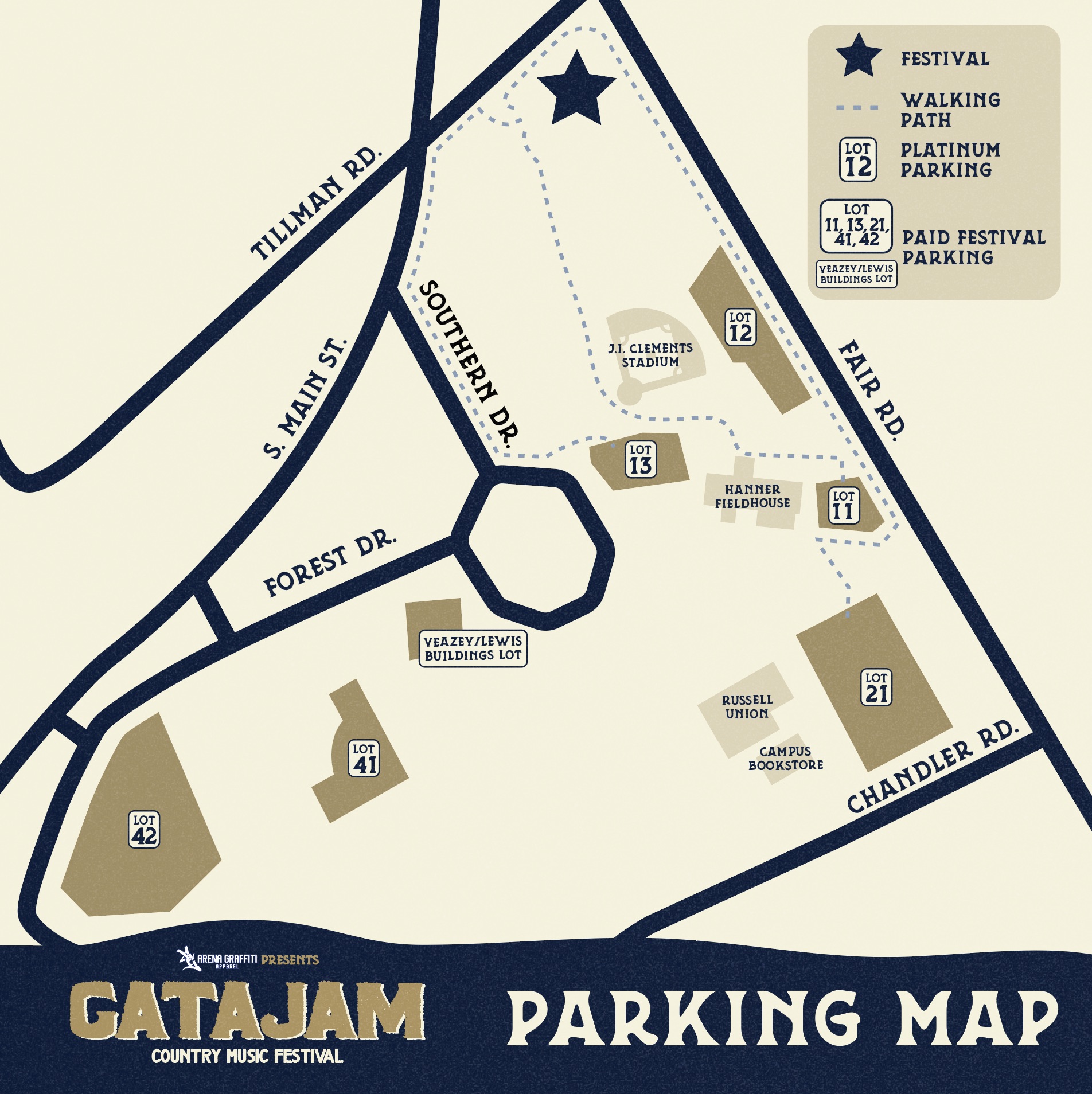 - FROM LOT #21 (Russel Union Lot): Use sidewalk on Fair Rd to concert site (can either go all the way up to Tillman Rd sidewalk OR to walking track outside perimeter of concert site to the GA / Pit Entrance)