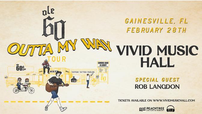OLE 60 : OUTTA MY WAY TOURw/ ROB LANGDONwww.ole60music.comat Vivid Music Hall (Gainesville, FL)Presented by Peachtree Entertainment and Airbound EntertainmentFriday, February 28th, 202518+ ShowAdvance GA Tickets (Early Bird): $25.00 (Public on-sale Fri. 11/22/24)Advance GA Tickets: $30.00 (after early bird)Public Doors - 7:00pmShowtime - 8:00pm