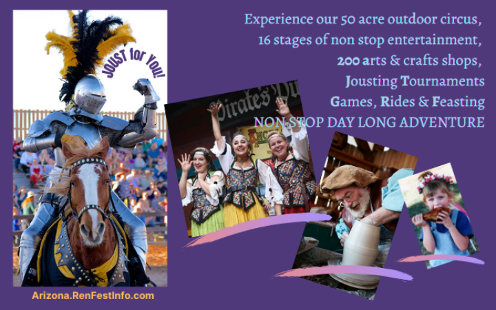 The AZ Renaissance Festival transports visitors to a medieval amusement park, a 16-stage theater, a 50-acre circus, an arts and crafts extravaganza, a jousting tournament, people powered games and rides, mermaids and a feast -- all rolled into one non-stop, ALL-DAY adventure.