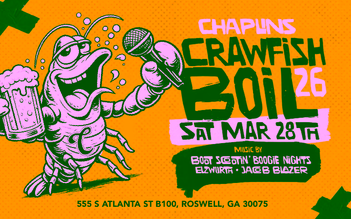 Roswell GA, The Chaplin's Crawfish Boil is back! Formerly Kramer's (Buckhead) 18th Annual Crawfish Boil kicks off March 28at 3PM till 11PM—spicy crawfish, cold drinks, live music by Jacob Blazer, Elzwurth, and Boot Scootin Boogie Nights (a night of 90's Country). Come see why it will always be a tradition.