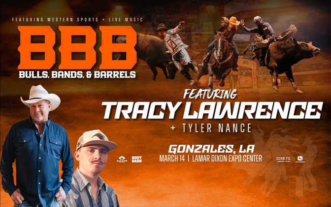 That's right folks, the BBB will be in Gonzales, LA for ONE NIGHT ONLY on March 14, 2026 at the Lamar Dixon Expo Center! We have taken the rodeo world and turned it upside down with our new concept. We will have some of the rankest bulls and bull riders in the Southeast as well as some of the fastest equine to ever go around a 3 barrel pattern. On the concert side, following the bulls & barrels, Tracy Lawrence and Tyler Nance will finish the night off with a bang! This will be the ONE event you don't want to miss!!
