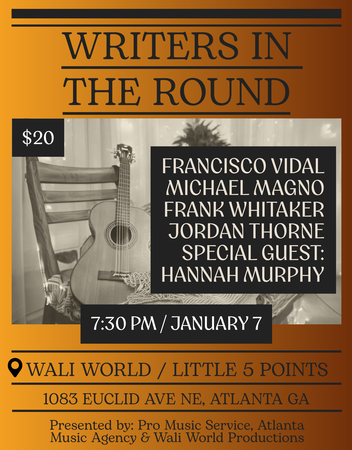 Join us for a Writers In The Round, An acoustic night of stories, original music, and performances by Francisco Vidal, Michael Magno, Frank Whitaker, Jordan Thorne, and special guests Hannah Murphy & DENI