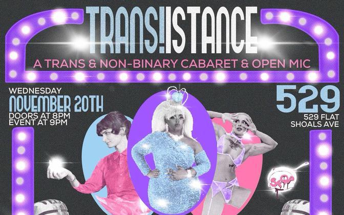 You’re invited to TRANSISTANCE! A Trans & Non-Binary Cabaret & Open Mic happening Wednesday, Nov 20th at 529 (529 Flat Shoals AVE SE Atlanta, GA 30316). Come enjoy this intentional function for trans & non-binary folks to share art, space, and community! Sign-up for the open mic will be at the front table at the event! Open to music, poetry, comedy, drag, burlesque, & more.
