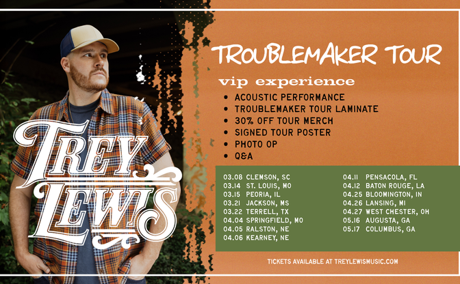 Welcome to the 'Trey Lewis VIP Fan Experience'. Included in this ticket purchase is a custom 'Troublemaker Tour" laminate, an intimate acoustic performance by Trey Lewis, 30% off all tour merchandise during the show, Photo Op with Trey, Q&A, and a signed tour poster.