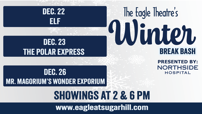 Make the most of your winter break staycation in Downtown Sugar Hill! No need to travel far for fun as The Eagle Theatre has your winter break plans covered with Winter Break Bash Movies. This year, we are offering 50 exclusive movie passes for just $6. With this pass, you can enjoy every movie throughout the week and receive one free popcorn per visit.