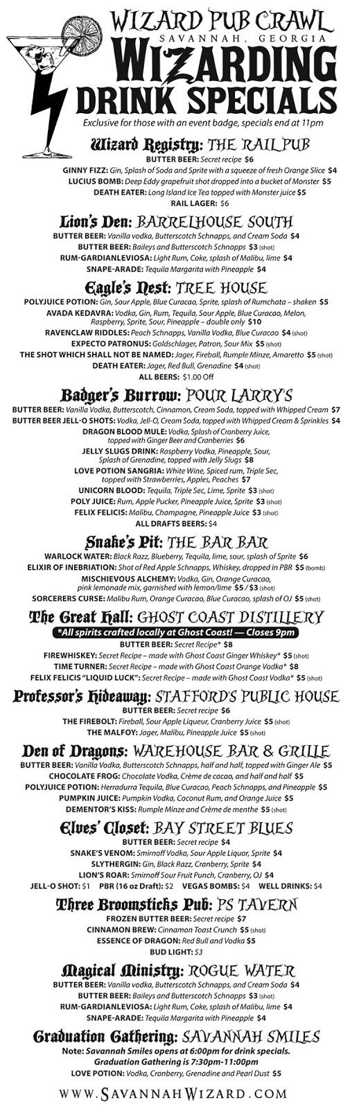 • Consider making it a WIZARD WEEKEND by attending the next day's Wizard Pub Crawl in downtown Savannah. More info. on that event at www.WizardPubCrawl.com (21+)
