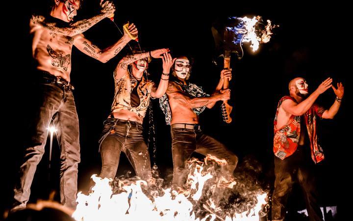 Daikaiju is a mysterious chimera of sound and imagery that was first sighted in the winter of 1999. Entities of sonic mayhem, Daikaiju takes the sound of waves crashing and shrieking atomic lizards and makes it rock in a way that instills shock and awe in all who experience their shows-a highly interactive and confrontational performance that literally draws the audience into the massive vortex of sound generated by the band. Concealed behind masks, this troupe of mystery people create a mutant style of epic, high energy instrumental rock that seamlessly incorporates a wide variety of musical styles including surf, punk, noise, metal, psychedelic and progressive rock.