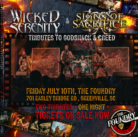Get ready for an electrifying night of powerhouse rock as Wicked Serenity (Godsmack tribute) and Signs of Sacrifice (Creed tribute) unite for one unforgettable show. Experience the thunderous riffs, gritty vocals, and explosive energy of Godsmack alongside the soaring melodies, emotional anthems, and iconic hooks of Creed—all delivered with stunning authenticity.