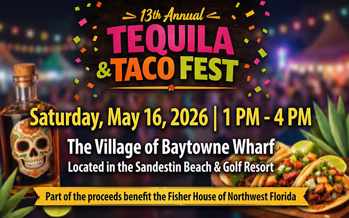 The 13th Annual Tequila & Taco Fest at The Village of Baytowne Wharf. Local restaurants will be competing for the Best Taco and Best Margarita on The Emerald Coast!