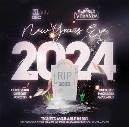 21+ Get ready to ring in the new year at Veranda's RIP 2023 NYE Party! This epic OPEN BAR event is going down on December 31st at Veranda, located on Crescent Ave, ya gotta be there! Bring your all black attire to celebrate 2023's funeral while welcoming in the new year. With ice-cold beers and drinks flowin' all night long, you won't be thirsty! And you know we've got the hottest DJ in town droppin' sick beats that'll have you movin' and groovin' all night! So grab your crew and get ready for the wildest, most unforgettable New Year's Eve bash this side of ATL! ??? Don't miss out, this is gonna be one for the books!